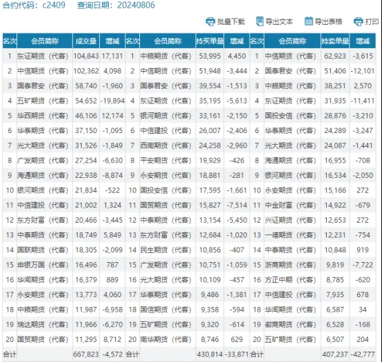 从持仓报告看,C2409总成交量为66.7万余手,较前一日略微减少四千五百余手。6日多头主力减少33871手,空头主力减少42777手。资金移仓远月合约迹象较为明显。