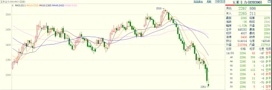 七月份玉米盘面疯狂暴跌,主力合约下跌158点,跌幅高达6.3%。进入八月份后,依然没能阻挡住下跌趋势。短短四个交易日,已经下跌86点,盘中最低跌至2261元。和七月崩盘式的暴跌,略微不同的是,近几日,更像是踩踏式大回落,市场已经十分脆弱。